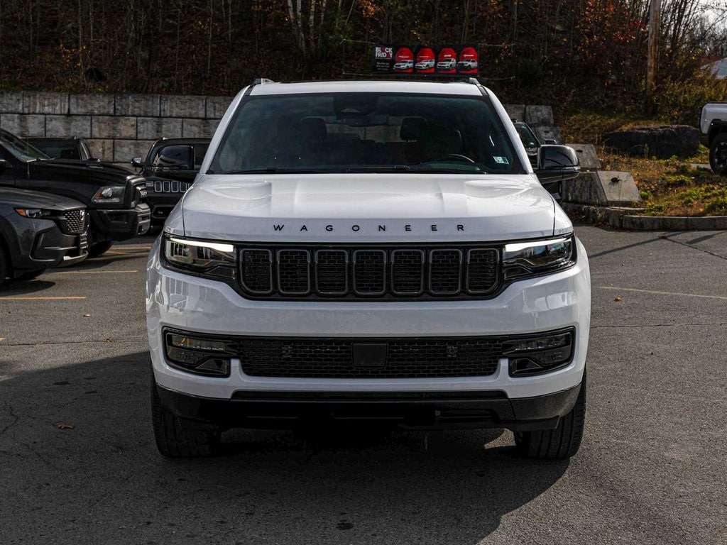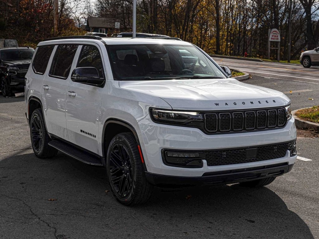 BLUE TOOTH, NAVIGATION, ALLOY WHEELS, PANORAMIC SUNROOF, LEATHER, BACK UP CAMERA, Wagoneer Series II Carbide, 4D Sport Utility, 3.0L I6, 8-Speed Automatic, 4WD, Bright White Clearcoat, Global Black w/Leather Trimmed Bucket Seats, Premium Group I, 10 Speakers, 118 MPH Maximum Speed Calibration, 3 Panel Sunroof, 3rd row seats: bench, 4-Wheel Disc Brakes, ABS brakes, Adaptive Cruise Control, Adjustable Roof Rail Crossbars, AM/FM radio: SiriusXM with 360L, Anti-whiplash front head restraints, Apple CarPlay/Android Auto, Auto Adjust In Reverse Exterior Mirrors, Auto-Dimming Exterior Driver Mirror, Auto-dimming Rear-View mirror, Auto-leveling suspension, Automatic temperature control, Black Exterior Accents, Brake assist, Carbide Appearance Package, Cargo Cover, Dual front impact airbags, Dual front side impact airbags, Electronic Stability Control, Exterior Mirrors w/Memory, Exterior Mirrors w/Supplemental Signals, Four wheel independent suspension, Front dual zone A/C, Front fog lights, Fully automatic headlights, Garage door transmitter, Genuine wood console insert, Genuine wood dashboard insert, Genuine wood door panel insert, Heated Exterior Mirrors, Heated front seats, Heated rear seats, Heated steering wheel, Illuminated entry, Knee airbag, Leather Trimmed Bucket Seats, Low tire pressure warning, Memory seat, Navigation System, Normal Duty Suspension, Occupant sensing airbag, Overhead airbag, Panic alarm, ParkView Rear Back-Up Camera, Power adjustable front head restraints, Power door mirrors, Power driver seat, Power Liftgate, Power passenger seat, Quick Order Package 25F Carbide, Radio: Uconnect 5 Nav w/10.1" Display, Rear dual zone A/C, Rear window defroster, Reclining 3rd row seat, Remote keyless entry, Reversible Carpet/Vinyl Cargo Mat, Security system, Speed-sensing steering, Steering wheel memory, Telescoping steering wheel, Tilt steering wheel, Traction control, Turn signal indicator mirrors, Ventilated front seats, Wheels: 22" x 9.0" Painted Gloss Black.