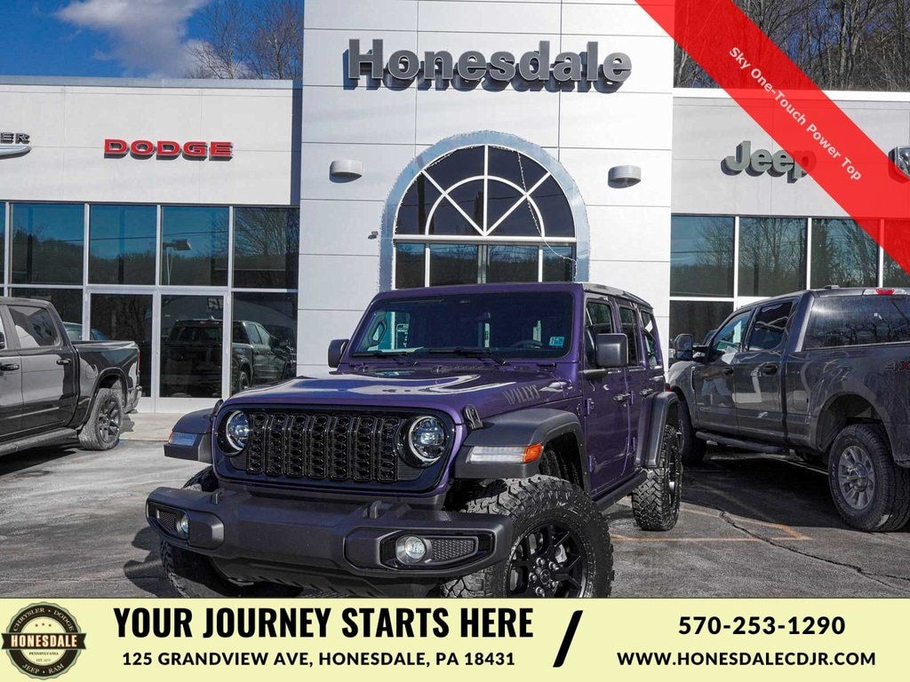 BLUE TOOTH, NAVIGATION, ALLOY WHEELS, BACK UP CAMERA, Wrangler Willys, 4D Sport Utility, 2.0L I4 DOHC, 8-Speed Automatic, 4WD, Reign, Black w/Cloth Low-Back Bucket Seats, Convenience Group, Sky One-Touch Power Top, 12.3" Touchscreen Display, 2-Door Passive Entry, Front Door Locks, 4-Wheel Disc Brakes, 4-Wheel Drive Swing Gate Decal, 4.10 Rear Axle Ratio, 4G LTE Wi-Fi Hot Spot, 7 and 4 Pin Wiring Harness, 8 Speakers, ABS brakes, Advanced Brake Assist, Air Conditioning with Auto Temp Control, Air Filtering, Alpine Premium Audio System, Apple CarPlay/Android Auto, Automatic Headlamps, Auxiliary Switches, Black Grille with Gloss Black Rings, Class II Receiver Hitch, Cloth Low-Back Bucket Seats, Cluster 7.0" TFT Color Display, Conventional Differential Front Axle, Corning Gorilla Glass, Dana M210 Wide HD Tube Front Axle, Dana M220 Wide Rear Axle, Daytime Running Lamps LED Accents, Deep Tint Sunscreen Windows, Dual front impact airbags, Dual front side impact airbags, E-Locker Rear Axle, Electronic Stability Control, Enhanced Adaptive Cruise Control, Front LED Fog Lamps, Full Speed Forward Collision Warning Plus, Heated Front Seats, Heated Steering Wheel, Illuminated entry, Injection Molded Black Rear Bumper, LED Premium Reflector Headlamps, Low tire pressure warning, Mold in Color Bumper with Gloss Black, Molded in Color Rubicon Highline Flare, Normal Duty Suspension, Occupant sensing airbag, Off-Road Plus Mode, Overhead airbag, Panic alarm, ParkView Rear Back-Up Camera, Power Dome Dual Vented Hood, Power Heated Mirrors, Power Top Quarter Window Storage Bag, Premium Wrapped Steering Wheel, Quick Order Package 22W Willys, Radio: Uconnect 5 with 12.3" Display, Rear Window Defroster, Rear Window Wiper/Washer, Remote keyless entry, Removable Rear Quarter Windows, Security Alarm, SiriusXM with 360L, Steel Power Dome Hood Package, Sun Visors with Illuminated Vanity Mirrors, Telescoping steering wheel, Tilt steering wheel, Traction control, Universal Garage Door Opener, Wheels: 17" x 7.5" Painted Black, Willy's Suspension, Willys Hood Decal.