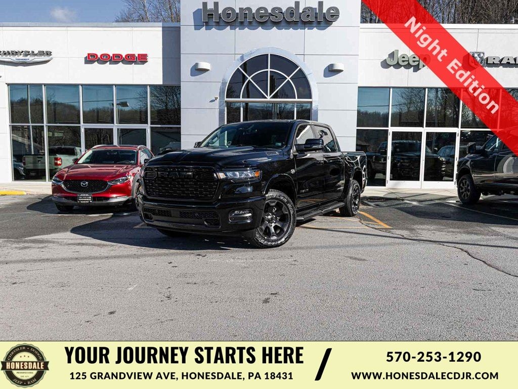 BLUE TOOTH, NAVIGATION, ALLOY WHEELS, BACK UP CAMERA, 1500 Big Horn/Lone Star, 4D Crew Cab, HEMI 5.7L V8 Multi Displacement VVT eTorque, 8-Speed Automatic, 4WD, Diamond Black Crystal Pearlcoat, Black w/Deluxe Cloth Bucket Seats, Night Edition, 115V Auxiliary Power Outlet, 115V Auxiliary Rear Power Outlet, 12" Touchscreen Display, 2nd Row In Floor Storage Bins, 3 Rear Seat Head Restraints, 4 Way Front Headrests, 4-Wheel Disc Brakes, 400W Inverter, 4G LTE Wi-Fi Hot Spot, 9 Amplified Speakers w/Subwoofer, ABS brakes, Accent Color Door Handles, Accent Color Tailgate Handle, Adaptive Cruise Control, Air Conditioning ATC w/Dual Zone Control, Anti-Spin Differential Rear Axle, Apple CarPlay/Android Auto, Auto High-beam Headlights, Auto Power-Folding Mirrors, Auto-Dimming Exterior Driver Mirror, Auto-Dimming Rear-View Mirror, Big Horn Level 2 Equipment Group, Black Exterior Truck Badging, Black Headlamp Bezels, Black Interior Accents, Black Painted Exterior Mirrors Caps, Black Tail Lamp Bezels, Body Color Fender Flares, Body Color Front Bumper, Body Color Rear Bumper w/Step Pads, Brake assist, Center Console Parts Module, Cluster 7.0" TFT Color Display, Configurable Drive Mode, Connected Travel & Traffic Services, Connectivity - US/Canada, Convex Wide-Angle Exterior Mirror Insert, Deluxe Cloth Bucket Seats, Disassociated Touchscreen Display, Dual Exhaust w/Black Tips, Dual front impact airbags, Dual front side impact airbags, Electronic Stability Control, Exterior Mirrors Courtesy Lamps, Exterior Mirrors w/Heating Element, Exterior Mirrors w/Supplemental Signals, Front fog lights, Front wheel independent suspension, Full Length Floor Console, Fully automatic headlights, Global Telematics Box Module (TBM), Glove Box Lamp, GPS Antenna Input, GPS Navigation, Grille Black Surround Black Mesh, HD Radio, Heated Front Seats, Heated Steering Wheel, Illuminated entry, Integrated Center Stack Radio, Integrated Voice Command w/Bluetooth, Leather Wrapped Steering Wheel, LED Dome Lamp w/On/Off Switch, LED Footwell Lighting, Low tire pressure warning, Media Hub w/2 Charge Only USBs, Mopar Black Tubular Side Steps, Occupant sensing airbag, Overhead airbag, Overhead LED Lamps, Panic alarm, ParkView Rear Back-Up Camera, Power 2-Way Driver Lumbar Adjust, Power Adjust 8-Way Driver Seat, Power Adjustable Pedals, Power door mirrors, Premium Overhead Console, Quick Order Package 27Z Big Horn, Radio: Uconnect 5 Nav w/12.0" Display, RAM Grille Badge - Black, Rear 60/40 Folding Seat, Rear Center Armrest, Rear Power Sliding Window, Rear Window Defroster, Remote keyless entry, Remote Tailgate Release, Security Alarm, SiriusXM Radio Service, SiriusXM w/360L, Steering Wheel Mounted Audio Controls, Sun Visors w/Illuminated Vanity Mirrors, Telescoping steering wheel, Tilt steering wheel, Traction control, Universal Garage Door Opener, USB Host Flip, Wheels: 20" x 9.0" Aluminum Painted Clad.