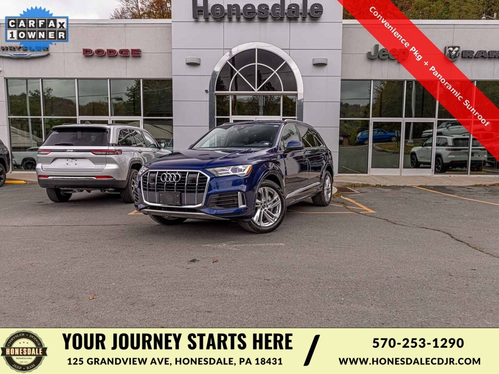 2023 Audi Q7 45 Premium quattro ONE OWNER, BLUE TOOTH, NEW PA STATE INSPECTION, FULLY RECONDITIONED, NAVIGATION, ALLOY WHEELS, PANORAMIC SUNROOF, LEATHER, BACK UP CAMERA, Q7 45 Premium quattro, 4D Sport Utility, 2.0L 4-Cylinder TFSI, 8-Speed Automatic with Tiptronic, quattro, Navarra Blue Metallic, Black w/Leather Seating Surfaces, 10 Speakers, 3rd row seats: bench, 4-Wheel Disc Brakes, ABS brakes, Adaptive Cruise Assist w/Lane Guidance, Audi Phone Box w/Wireless Charging, Auto High-beam Headlights, Auto-dimming door mirrors, Auto-dimming Rear-View mirror, Automatic temperature control, Brake assist, Convenience Package, Dual front impact airbags, Dual front side impact airbags, Electronic Stability Control, Exterior Parking Camera Rear, Four wheel independent suspension, Front dual zone A/C, Front fog lights, Fully automatic headlights, Garage door transmitter: HomeLink, Genuine wood door panel insert, Heated door mirrors, Heated Front Bucket Seats, Heated Steering Wheel, Illuminated entry, Leather Seating Surfaces, Leather Shift Knob, Leather steering wheel, Low tire pressure warning, Memory seat, Navigation system: Audi MMI Navigation plus with Touch Response, Occupant sensing airbag, Overhead airbag, Power door mirrors, Power driver seat, Power Liftgate, Power passenger seat, Radio: Audi Sound System, Rain sensing wipers, Rear air conditioning, Rear side impact airbag, Rear window defroster, Rear window wiper, Reclining 3rd row seat, Remote keyless entry, Security system, Steering wheel memory, Telescoping steering wheel, Topview Camera System, Traction control, Turn signal indicator mirrors, Wheels: 20" 5-Spoke Turbine-Design.