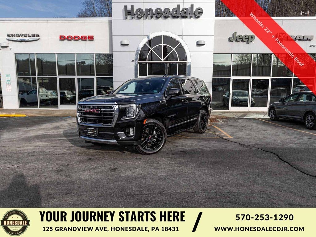 2023 GMC Yukon SLT CLEAN CARFAX, BLUE TOOTH, NEW PA STATE INSPECTION, FULLY RECONDITIONED, NAVIGATION, ALLOY WHEELS, PANORAMIC SUNROOF, LEATHER, BACK UP CAMERA, Wheels: 22" Black Painted, Yukon SLT, 4D Sport Utility, EcoTec3 5.3L V8, 10-Speed Automatic with Overdrive, 4WD, Onyx Black, Jet Black w/Perforated Leather-Appointed Seating, 2 Presets For Power Driver Seat, 3rd row seats: split-bench, 4-Wheel Disc Brakes, ABS brakes, AM/FM Stereo, Apple CarPlay/Android Auto, Auto High-beam Headlights, Automatic Emergency Braking, Automatic temperature control, Bose 9-Speaker Stereo Audio System Feature, Brake assist, Bright Chrome Bodyside Moldings, Bright Front & Rear Door Sill Plates, Chrome Door Handles w/Body-Color Strip, Cruise control, Dual front impact airbags, Dual front side impact airbags, Dual-Pane Panoramic Power Sunroof, Electronic Stability Control, Following Distance Indicator, Forward Collision Alert, Four wheel independent suspension, Front & Rear Park Assist, Front dual zone A/C, Front fog lights, Front Pedestrian Braking, Fully automatic headlights, Garage door transmitter, Hands-Free Power Programmable Rear Liftgate, Heated & Ventilated Driver & Front Passenger Seats, Heated door mirrors, Illuminated entry, Inside Rear-View Auto-Dimming Mirror, IntelliBeam Automatic High Beam On/Off, Lane Change Alert w/Side Blind Zone Alert, Lane Keep Assist w/Lane Departure Warning, Low tire pressure warning, Memory seat, Navigation System, Occupant sensing airbag, Overhead airbag, Perforated Leather-Appointed Seating, Power door mirrors, Power driver seat, Power passenger seat, Preferred Equipment Group 4SA, Premium Smooth Ride Suspension, Rear air conditioning, Rear Cross Traffic Alert, Rear window defroster, Remote keyless entry, Safety Alert Seat, Security system, SiriusXM w/360L, Telescoping steering wheel, Tilt steering wheel, Traction control, Universal Home Remote, Wireless Charging.