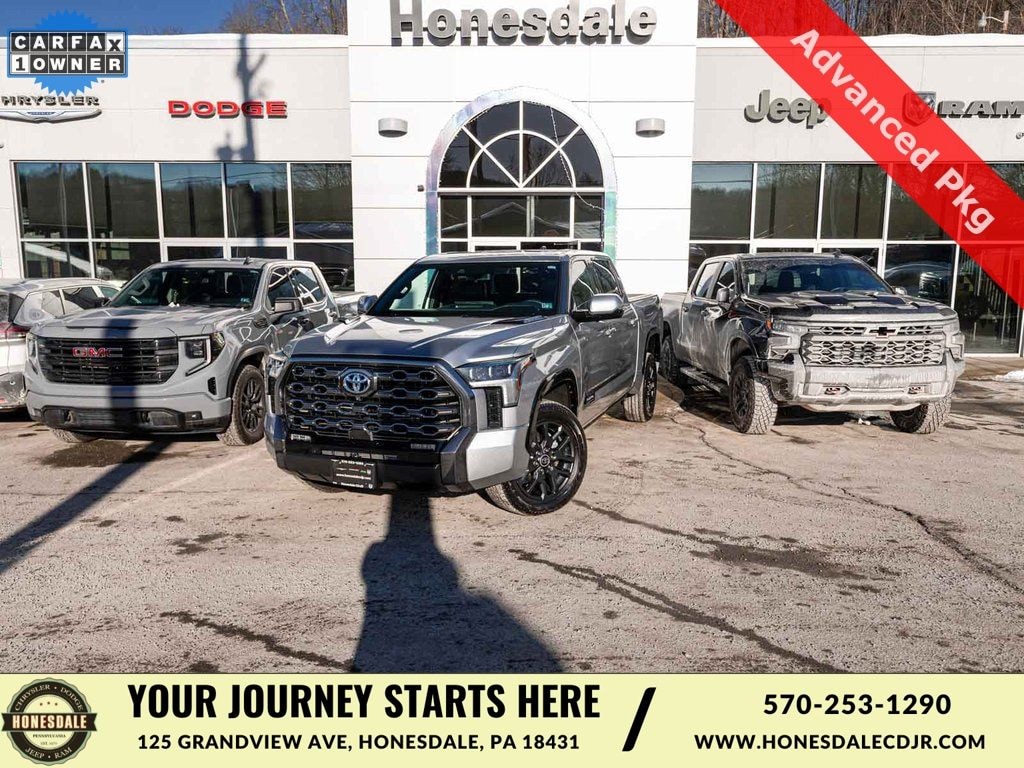2023 Toyota Tundra Hybrid Platinum CLEAN CARFAX, ONE OWNER, BLUE TOOTH, NEW PA STATE INSPECTION, FULLY RECONDITIONED, NAVIGATION, ALLOY WHEELS, PANORAMIC SUNROOF, LEATHER, BACK UP CAMERA, Tundra Hybrid Platinum, 4D Crew Cab, 3.4L V6, 10-Speed Automatic, 4WD, Celestial Silver Metallic, Black w/Leather Seat Trim, 12 Speakers, 4-Wheel Disc Brakes, ABS brakes, Adaptive Cruise Control, Advanced Package, AM/FM radio: SiriusXM, Apple CarPlay/Android Auto, Auto High-beam Headlights, Auto-dimming door mirrors, Auto-dimming Rear-View mirror, Automatic temperature control, Bed Step (TMS), Brake assist, Center Console Safe (TMS), Color Head Up Display, Dual front impact airbags, Dual front side impact airbags, Electronic Stability Control, Front dual zone A/C, Front fog lights, Front wheel independent suspension, Fully automatic headlights, Garage door transmitter: HomeLink, Heated & Ventilated Front Bucket Seats, Heated door mirrors, Heated rear seats, Heated steering wheel, Illuminated entry, Knee airbag, Leather Seat Trim, Leather Shift Knob, Load-Leveling Rear Height Control Air Suspension, Low tire pressure warning, Memory seat, Navigation System, Occupant sensing airbag, Overhead airbag, Power door mirrors, Power driver seat, Power passenger seat, Power Running Boards, Radio: Premium Audio w/JBL, Rear window defroster, Remote keyless entry, Security system, Steering wheel memory, Telescoping steering wheel, Tilt steering wheel, Traction control, Tri-Fold Tonneau Cover (TMS), Turn signal indicator mirrors, Ventilated rear seats, Wheels: 20" x 8" Dark-Painted Alloy. Odometer is 20632 miles below market average!